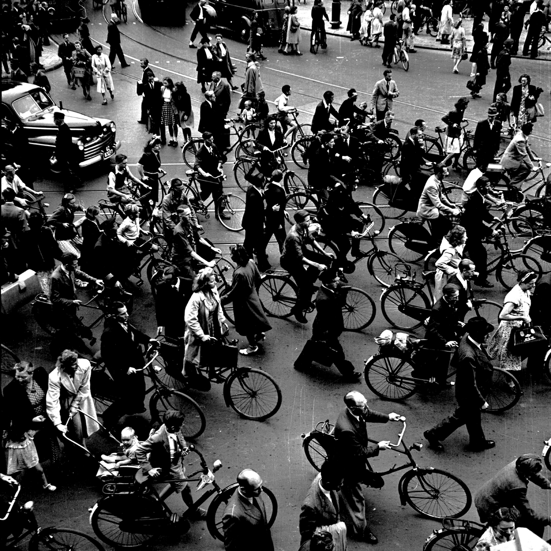Innerhalb der Fotografie entwickelte sich europaweit der Neorealismus, der von Menschlichkeit und Mitgefühl getragenen Idee einer besseren Gesellschaft, von der auch Maria Austrias Fotografien der 1950er Jahre erzählen. Unter Szenen vom Leben auf den Straßen, in den Cafés, auf den Märkten und Spielplätzen findet sich auch die Aufnahme »Amsterdam 1950«: ein typisches Motiv des Holländers mit seinem Fahrrad, einem robusten Tourenrad mit aufrechter Sitzposition, das zur Identität eines jeden Niederländers gehört. Es wurde nach dem Zweiten Weltkrieg gleichsam zum Sinnbild der Befreiung, hatten doch die deutschen Besatzer 1944 die Fahrräder konfisziert und damit der Bevölkerung ganz bewusst ihre Beweglichkeit genommen.